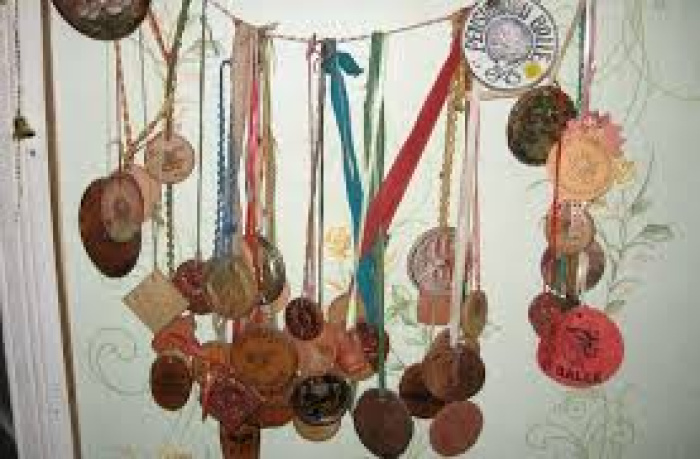 Gūdu saimineicys Janinys Dzalbis jubileju i kuozu pīminis i pateiceibys medalis, palykuse nalela daļa nu kolekcejis