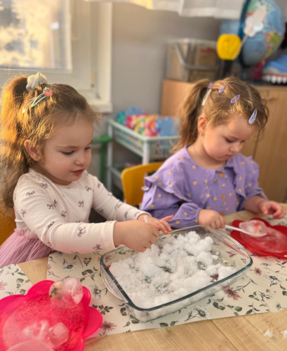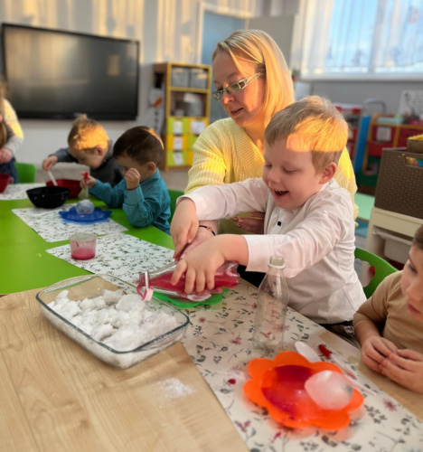 Skolotājas bija rūpīgi sagatavojušas dažādas aktivitātes, kas bērniem, praktiski darbojoties, palīdzēja iepazīt sniega īpašības. Kopā ar vecākiem bērni vēroja, kā sniegs kūst siltumā, kā mainās tā struktūra, pieskaroties tam ar rokām, un kā no sniega var veidot dažādas formas. Bērni vēroja, kas notiek ar sniegu, kad tas nokļūst ūdenī; izmēģināja pievienot krāsas, lai redzētu, kā sniegs tās uzsūc; pētīja, kā sniegs pārvēršas ūdenī un kas notiek ar ledus gabaliņiem, ja to ienes siltā telpā.