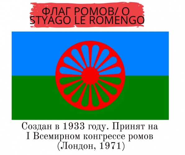 Флаг ромов разделён на две горизонтальных полосы. Сверху синяя символизирует небо. Зелёная снизу — символ травы, поля. В центре флага располагается красное восьмиспицевое колесо, которое одновременно символизирует «вечное кочевье духа».